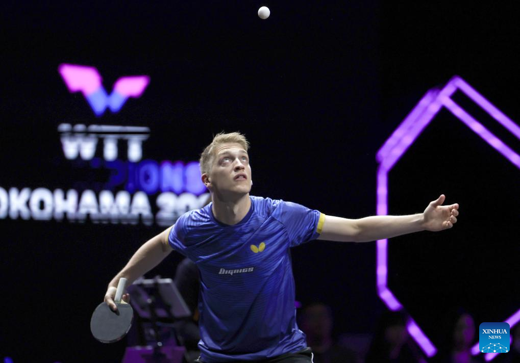 Anton Kallberg of Sweden serves during the men's singles round of 32 match between Xue Fei of China and Anton Kallberg of Sweden at the WTT Champions Yokohama 2025 in Yokohama, Japan, Aug. 7, 2025. (Xinhua/Yue Chenxing)