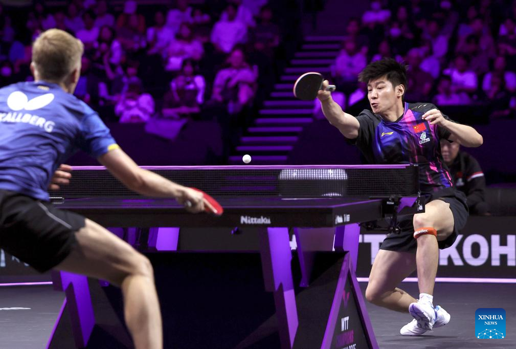 Xue Fei (R) of China returns the ball during the men's singles round of 32 match between Xue Fei of China and Anton Kallberg of Sweden at the WTT Champions Yokohama 2025 in Yokohama, Japan, Aug. 7, 2025. (Xinhua/Yue Chenxing)
