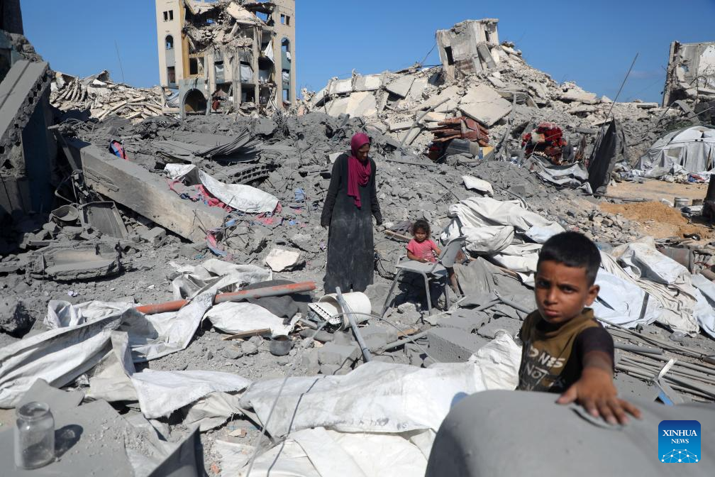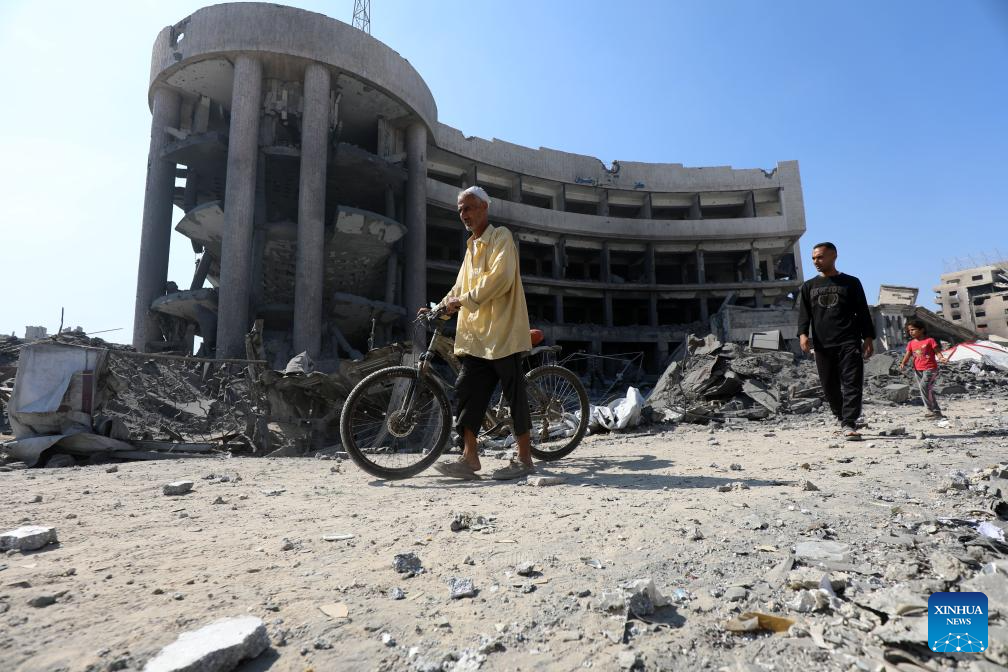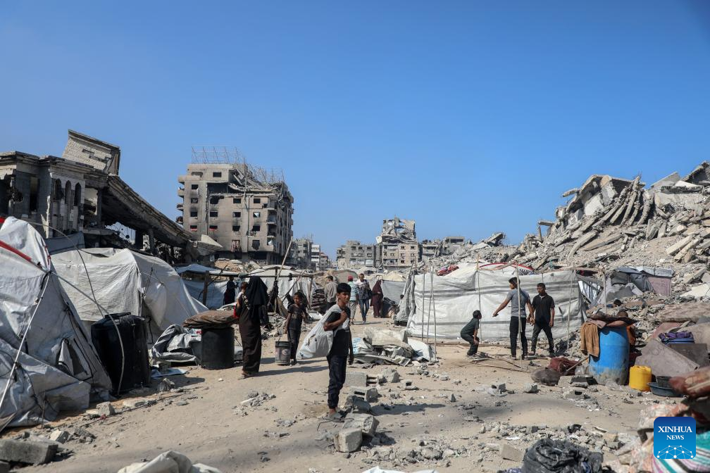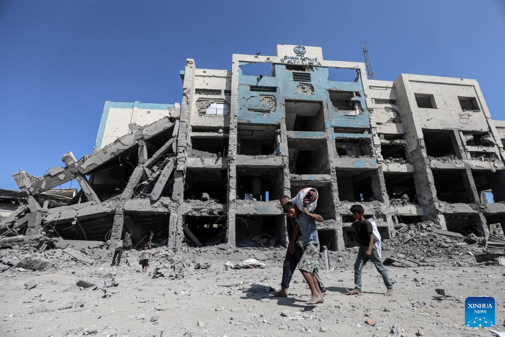 Palestinians pass the rubble after an Israeli airstrike in the Sheikh Radwan area, northwest of Gaza City, on Aug. 6, 2025. At least 27 Palestinians were killed in Israeli attacks on Wednesday, while 20 others died in a food truck overturn in the Gaza Strip, according to Palestinian sources. (Photo by Rizek Abdeljawad/Xinhua)