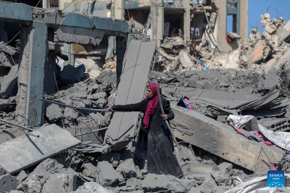 A Palestinian woman inspects the damage after an Israeli airstrike in the Sheikh Radwan area, northwest of Gaza City, on Aug. 6, 2025. At least 27 Palestinians were killed in Israeli attacks on Wednesday, while 20 others died in a food truck overturn in the Gaza Strip, according to Palestinian sources. (Photo by Rizek Abdeljawad/Xinhua)