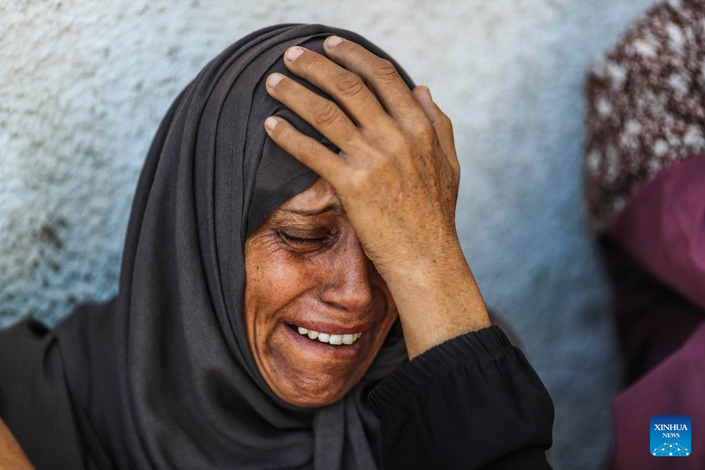 Palestinians mourn for victims at Al-Shifa Hospital in central Gaza City, on Aug. 6, 2025. At least 27 Palestinians were killed in Israeli attacks on Wednesday, while 20 others died in a food truck overturn in the Gaza Strip, according to Palestinian sources. (Photo by Mahmoud Zaki/Xinhua)