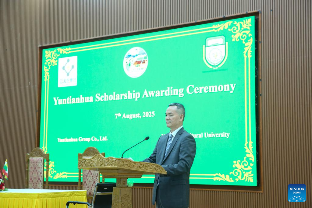 Ouyang Daobing, counselor of the Chinese Embassy in Myanmar, speaks during the sixth Yuntianhua Scholarship awarding ceremony at Yezin Agricultural University in Nay Pyi Taw, Myanmar, Aug. 7, 2025. The sixth Yuntianhua Scholarship awarding ceremony was held at Yezin Agricultural University in Nay Pyi Taw, Myanmar, on Thursday. Yuntianhua Group Co., Ltd., a Chinese comprehensive industrial group, awarded the scholarship to 104 students. (Xinhua/Myo Kyaw Soe)