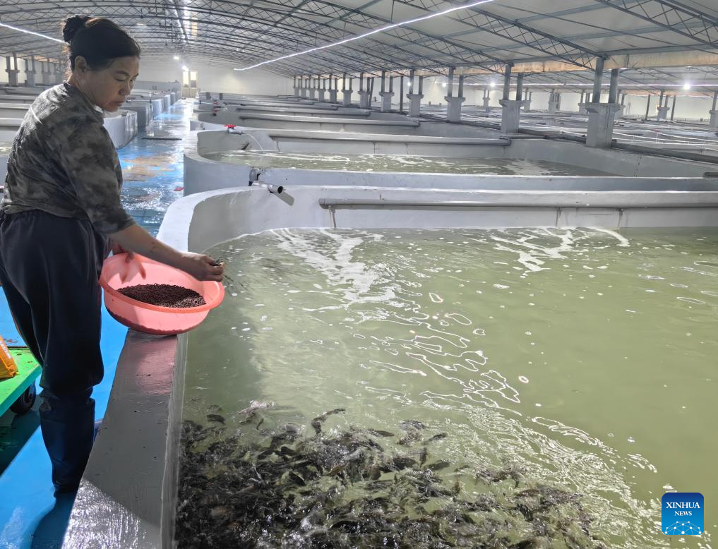 A worker feeds fish at a breeding workshop of a factory in Chengkou Town, Wudi County of east China's Shandong Province, on July 3, 2025. (Xinhua/Shao Kun)