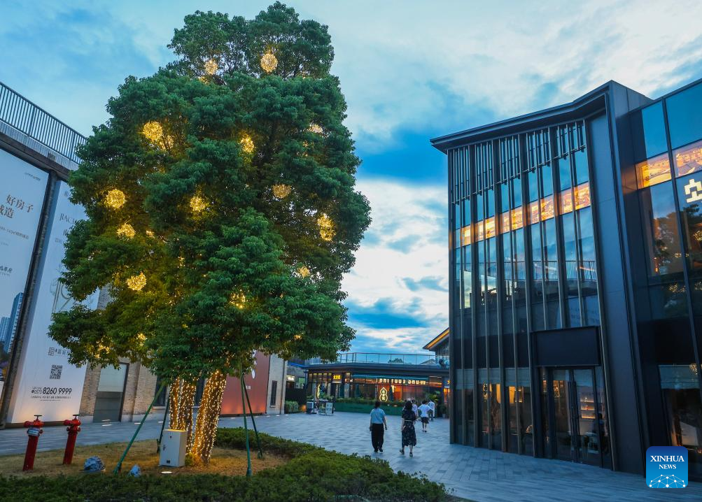 This photo shows a business district in Nanhu District of Jiaxing City, east China's Zhejiang Province, Aug. 7, 2025. Business districts and historical areas in Nanhu District of Jiaxing City have collaborated with hotels, shopping malls and restaurants to host distinctive summer night markets, attracting residents to enjoy their leisure time. (Xinhua/Xu Yu)