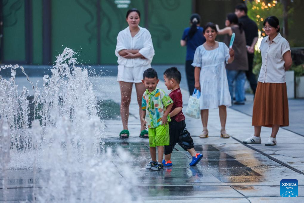 Children play with water at a business district in Nanhu District of Jiaxing City, east China's Zhejiang Province, Aug. 7, 2025. Business districts and historical areas in Nanhu District of Jiaxing City have collaborated with hotels, shopping malls and restaurants to host distinctive summer night markets, attracting residents to enjoy their leisure time. (Xinhua/Xu Yu)