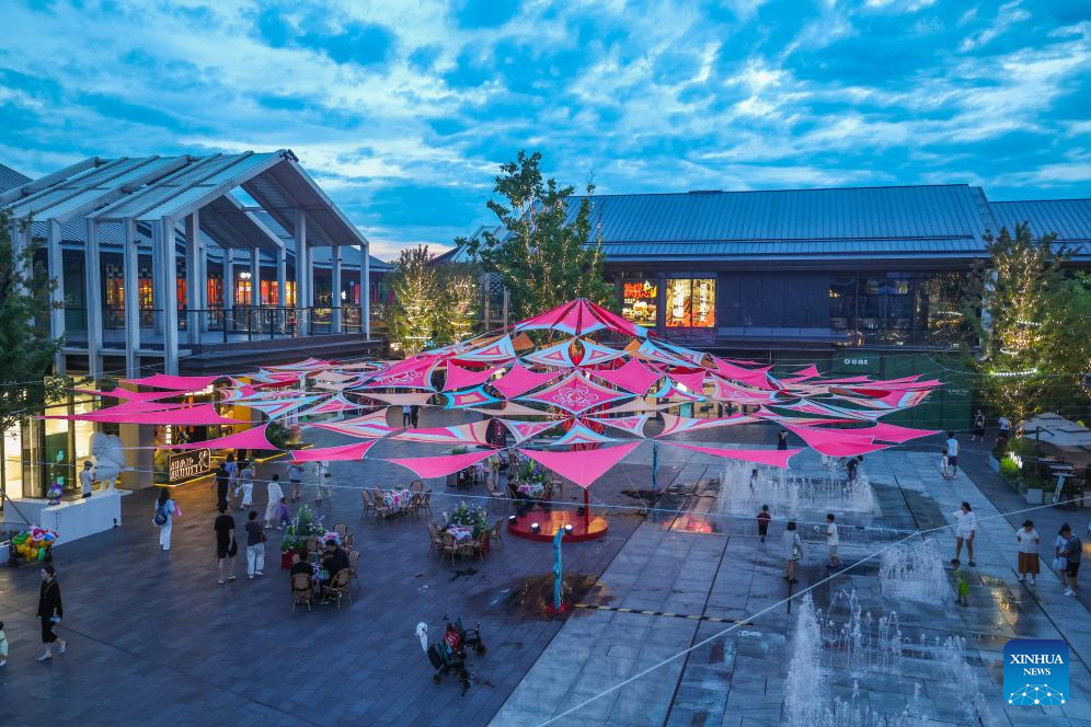Residents enjoy their leisure time at a business district in Nanhu District of Jiaxing City, east China's Zhejiang Province, Aug. 7, 2025. Business districts and historical areas in Nanhu District of Jiaxing City have collaborated with hotels, shopping malls and restaurants to host distinctive summer night markets, attracting residents to enjoy their leisure time. (Xinhua/Xu Yu)