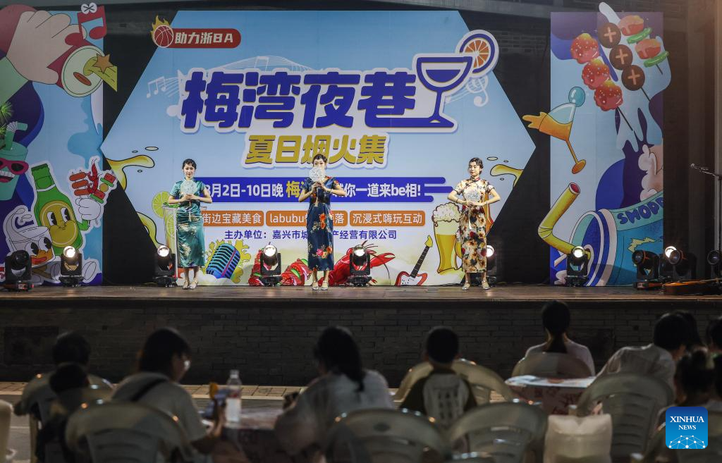 A performance is staged at a night market in Nanhu District of Jiaxing City, east China's Zhejiang Province, Aug. 7, 2025. Business districts and historical areas in Nanhu District of Jiaxing City have collaborated with hotels, shopping malls and restaurants to host distinctive summer night markets, attracting residents to enjoy their leisure time. (Xinhua/Xu Yu)