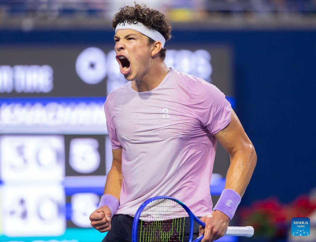 Ben Shelton of the United States celebrates scoring during the men's singles final match against Karen Khachanov of Russia at the 2025 National Bank Open tennis tournament in Toronto, Canada, on Aug. 7, 2025. (Photo by Zou Zheng/Xinhua)
