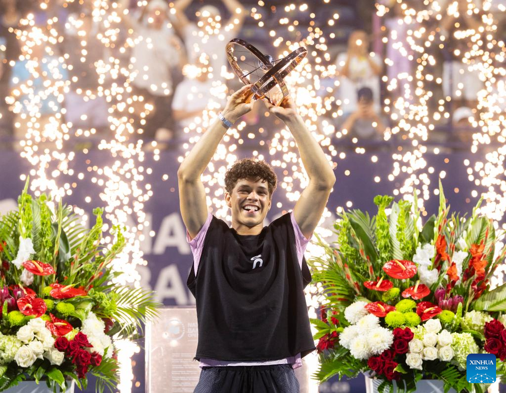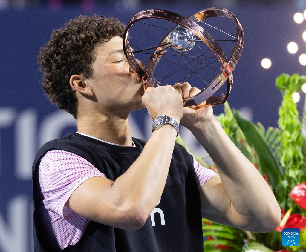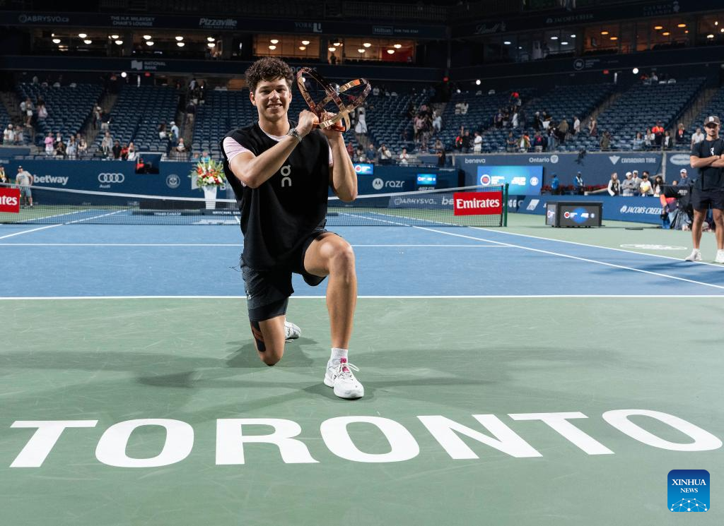Ben Shelton of the United States celebrates with the trophy after his win over Karen Khachanov of Russia in the men's singles final at the 2025 National Bank Open tennis tournament in Toronto, Canada, on Aug. 7, 2025. (Photo by Zou Zheng/Xinhua)