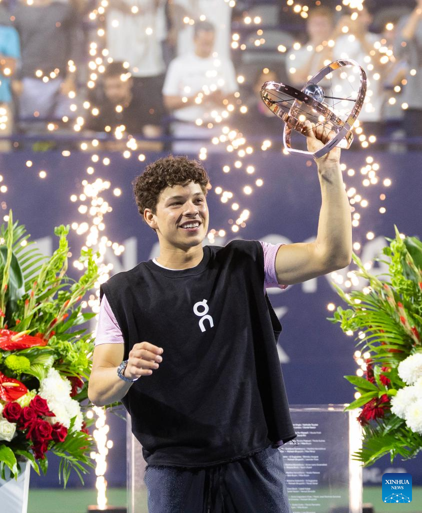 Ben Shelton of the United States poses with the trophy after his win over Karen Khachanov of Russia in the men's singles final at the 2025 National Bank Open tennis tournament in Toronto, Canada, on Aug. 7, 2025. (Photo by Zou Zheng/Xinhua)