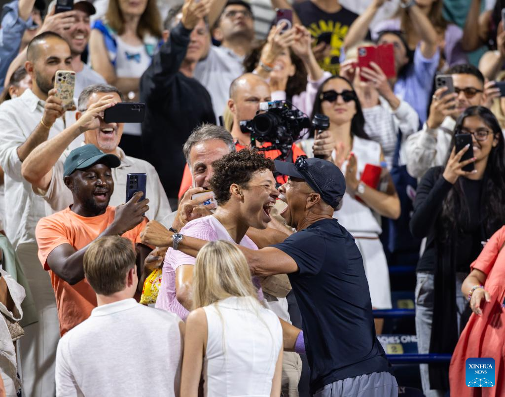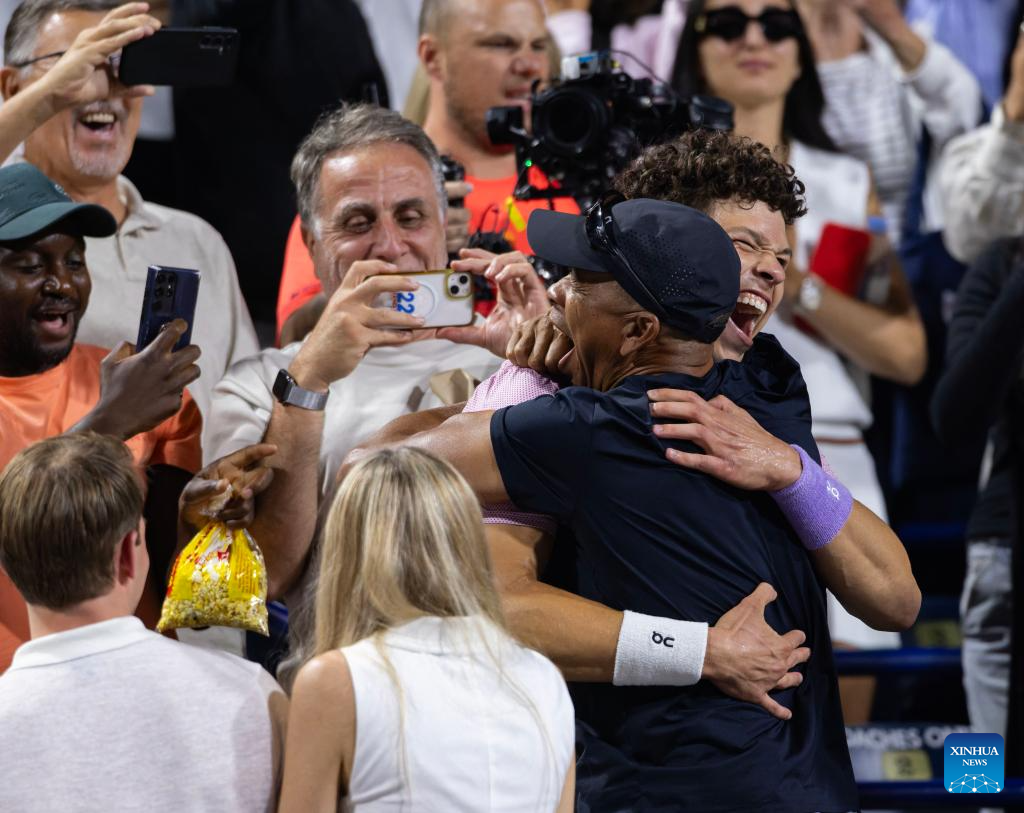 Ben Shelton (2nd R) of the United States celebrates victory with his father Bryan Shelton after winning over Karen Khachanov of Russia in the men's singles final at the 2025 National Bank Open tennis tournament in Toronto, Canada, on Aug. 7, 2025. (Photo by Zou Zheng/Xinhua)