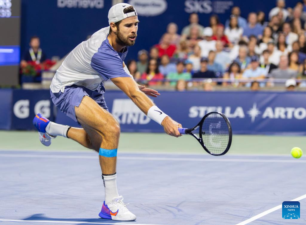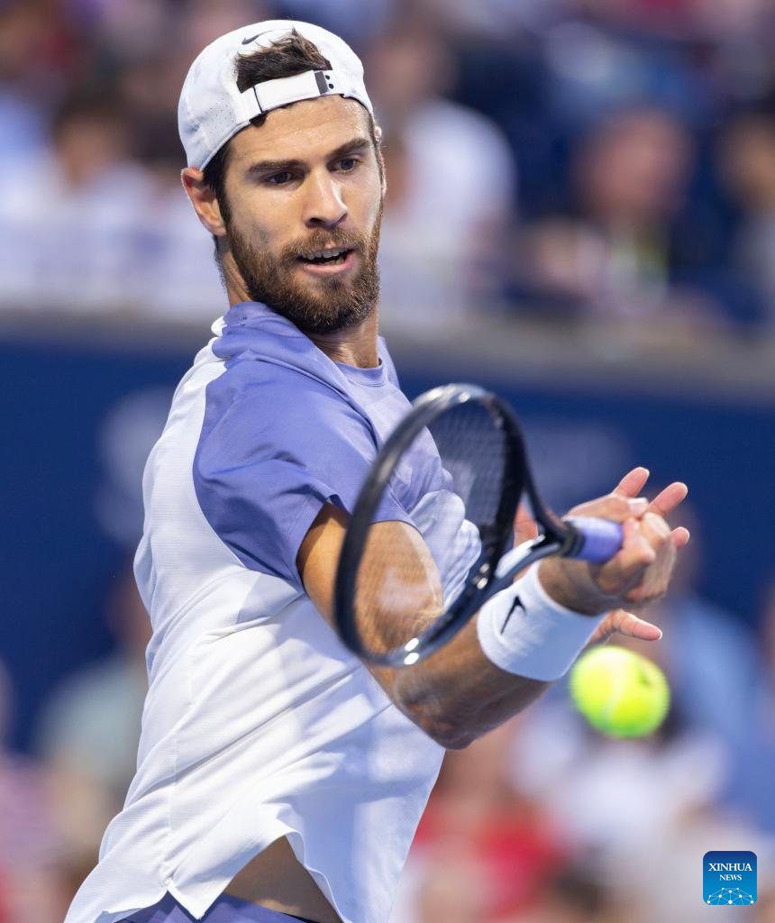 Karen Khachanov of Russia returns the ball during the men's singles final match against Ben Shelton of the United States at the 2025 National Bank Open tennis tournament in Toronto, Canada, on Aug. 7, 2025. (Photo by Zou Zheng/Xinhua)