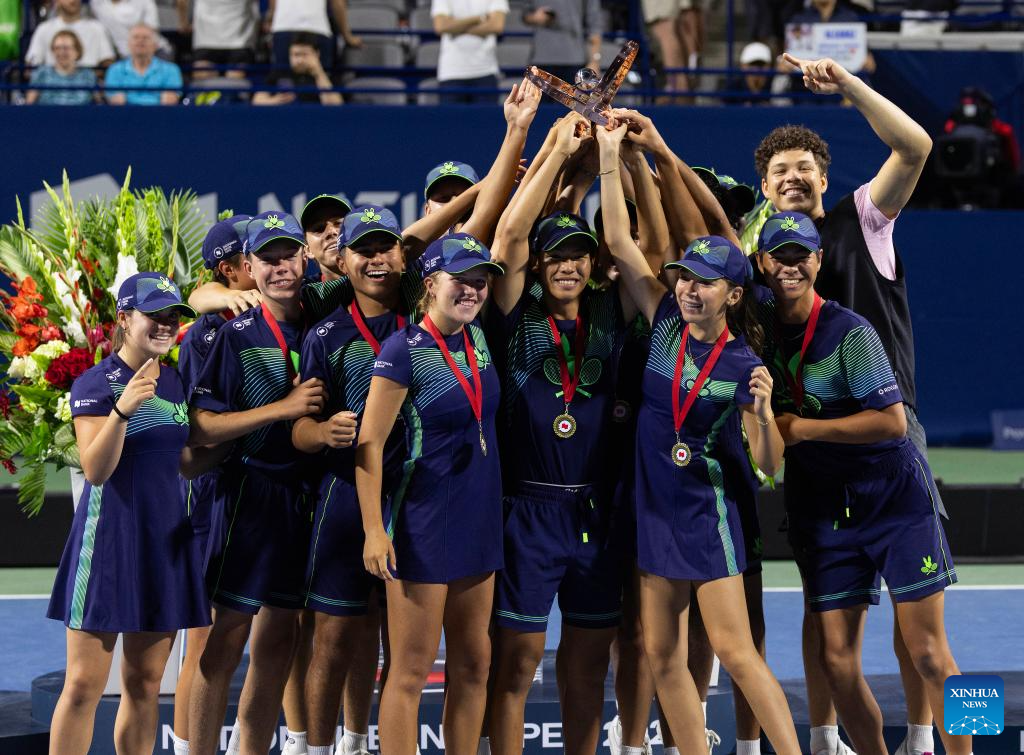 Ben Shelton (1st R) of the United States celebrates his win over Karen Khachanov of Russia with the ball kids team after the men's singles final at the 2025 National Bank Open tennis tournament in Toronto, Canada, on Aug. 7, 2025. (Photo by Zou Zheng/Xinhua)