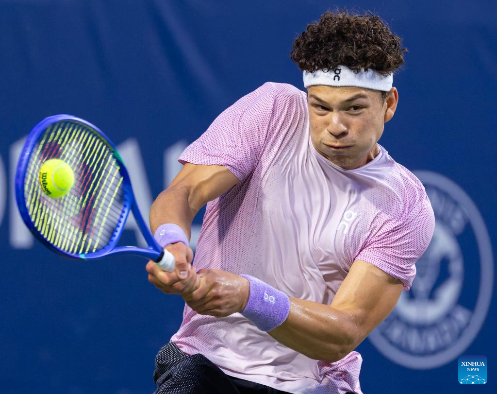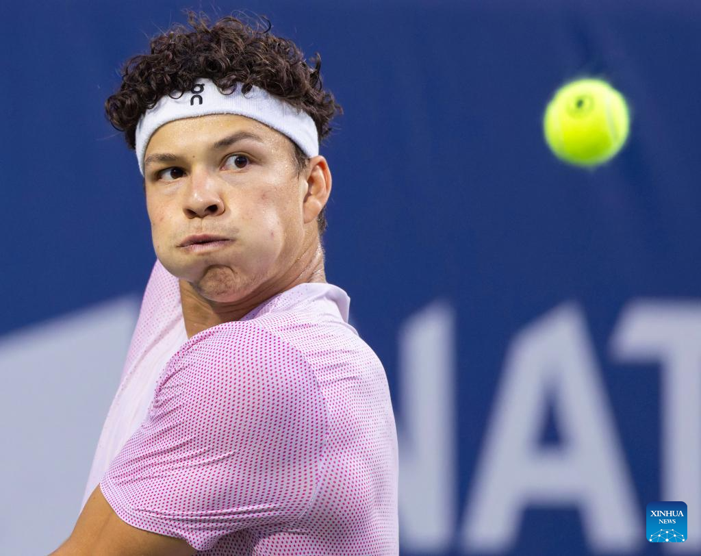 Ben Shelton of the United States returns the ball during the men's singles final match against Karen Khachanov of Russia at the 2025 National Bank Open tennis tournament in Toronto, Canada, on Aug. 7, 2025. (Photo by Zou Zheng/Xinhua)