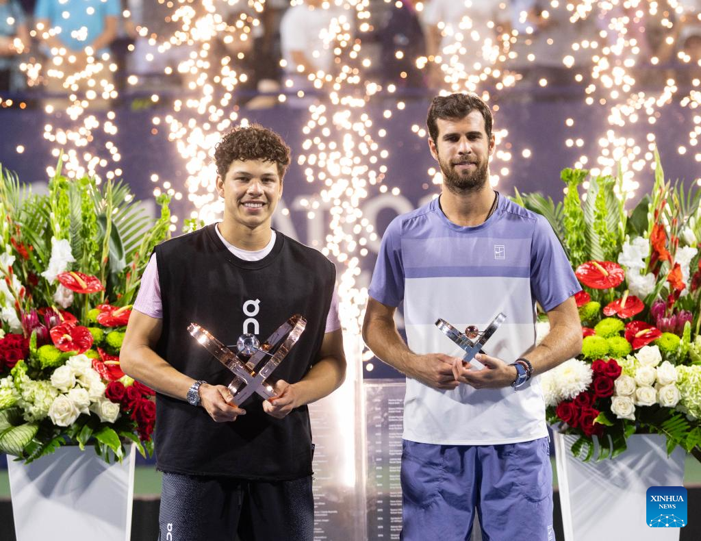 Ben Shelton (L) of the United States and Karen Khachanov of Russia pose for photos with their trophies during the awarding ceremony for the men's singles final at the 2025 National Bank Open tennis tournament in Toronto, Canada, on Aug. 7, 2025. (Photo by Zou Zheng/Xinhua)