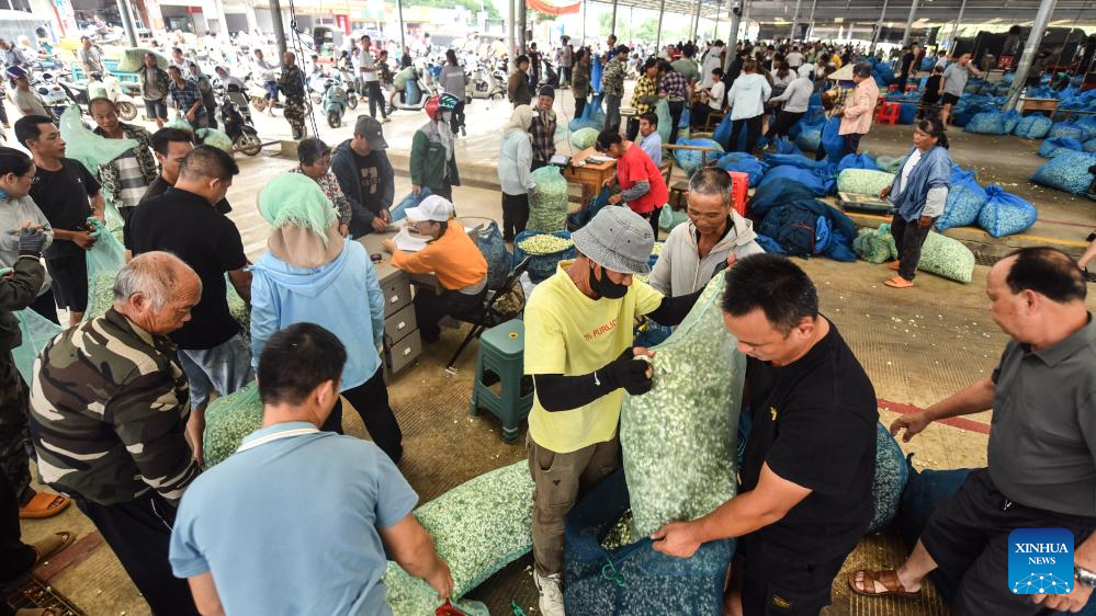 Tea farmers trade at a jasmine trading market in Hengzhou City, south China's Guangxi Zhuang Autonomous Region, on July 31, 2025. Hengzhou, dubbed the "hometown of jasmine in China," is home to some 340,000 jasmine flower farmers and over 180,000 mu (12,000 hectares) of jasmine fields.