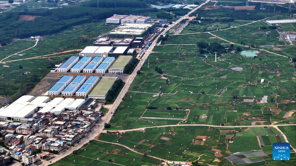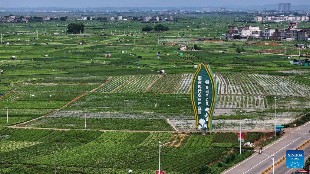 A drone photo taken on July 31, 2025 shows a view of a jasmine garden in Hengzhou City, south China's Guangxi Zhuang Autonomous Region. Hengzhou, dubbed the "hometown of jasmine in China," is home to some 340,000 jasmine flower farmers and over 180,000 mu (12,000 hectares) of jasmine fields.