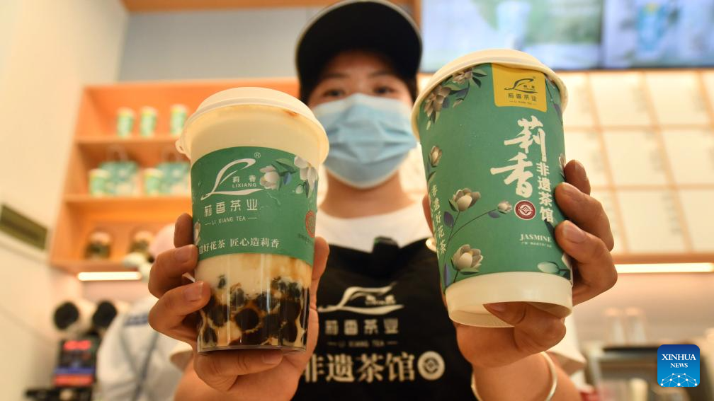 A shop assistant shows jasmine drinks ordered by customers at a tea-house in Hengzhou City, south China's Guangxi Zhuang Autonomous Region, July 31, 2025. Hengzhou, dubbed the "hometown of jasmine in China," is home to some 340,000 jasmine flower farmers and over 180,000 mu (12,000 hectares) of jasmine fields.