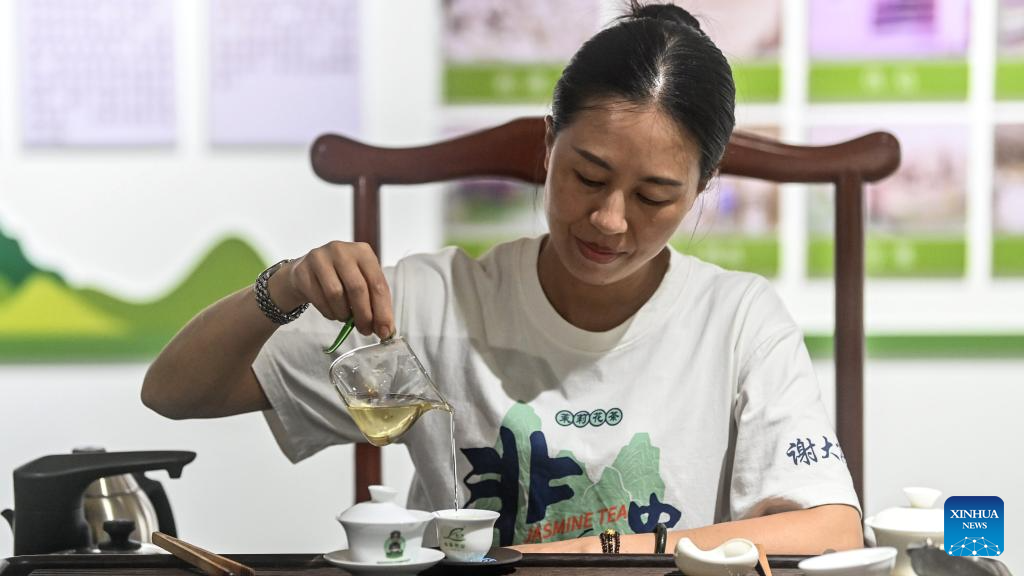 A shop assistant makes tea for tourists at a tea-house in Hengzhou City, south China's Guangxi Zhuang Autonomous Region, on July 31, 2025. Hengzhou, dubbed the "hometown of jasmine in China," is home to some 340,000 jasmine flower farmers and over 180,000 mu (12,000 hectares) of jasmine fields.