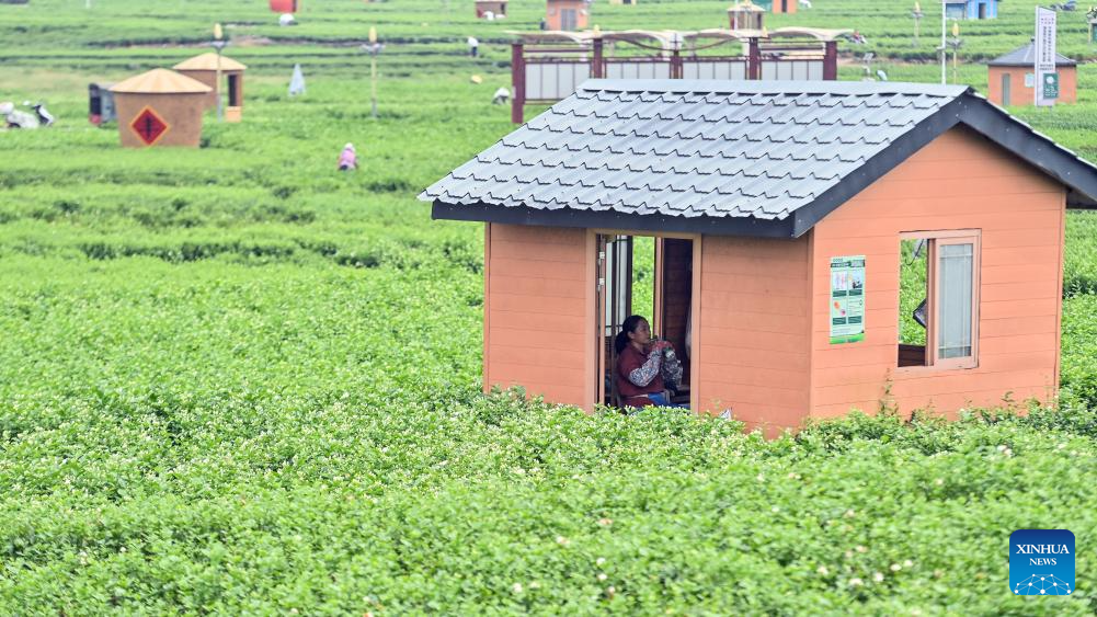 A tea farmer rests at a jasmine garden in Hengzhou City, south China's Guangxi Zhuang Autonomous Region, on July 31, 2025. Hengzhou, dubbed the "hometown of jasmine in China," is home to some 340,000 jasmine flower farmers and over 180,000 mu (12,000 hectares) of jasmine fields.