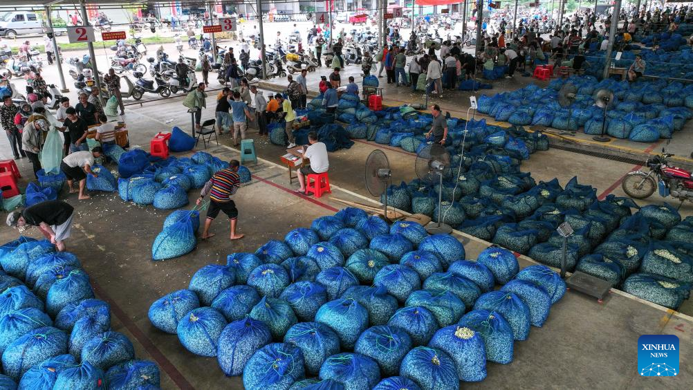 A drone photo taken on July 31, 2025 shows tea farmers selling fresh-picked jasmine flowers at a jasmine trading market in Hengzhou City, south China's Guangxi Zhuang Autonomous Region. Hengzhou, dubbed the "hometown of jasmine in China," is home to some 340,000 jasmine flower farmers and over 180,000 mu (12,000 hectares) of jasmine fields.