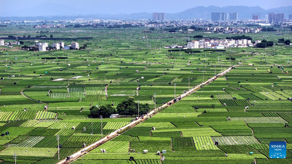 An aerial drone photo taken on July 31, 2025 shows a view of a jasmine garden in Hengzhou City, south China's Guangxi Zhuang Autonomous Region. Hengzhou, dubbed the "hometown of jasmine in China," is home to some 340,000 jasmine flower farmers and over 180,000 mu (12,000 hectares) of jasmine fields.