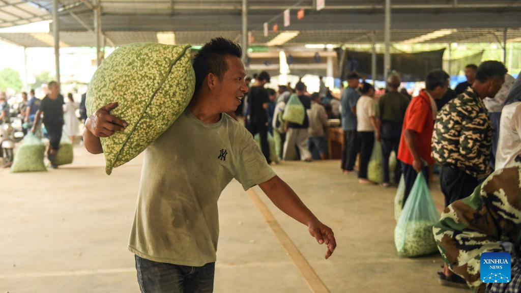 A tea farmer carrying jasmine flowers on his shoulder is pictured at a jasmine trading market in Hengzhou City, south China's Guangxi Zhuang Autonomous Region on July 31, 2025. Hengzhou, dubbed the "hometown of jasmine in China," is home to some 340,000 jasmine flower farmers and over 180,000 mu (12,000 hectares) of jasmine fields.