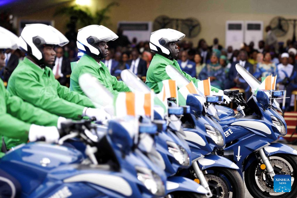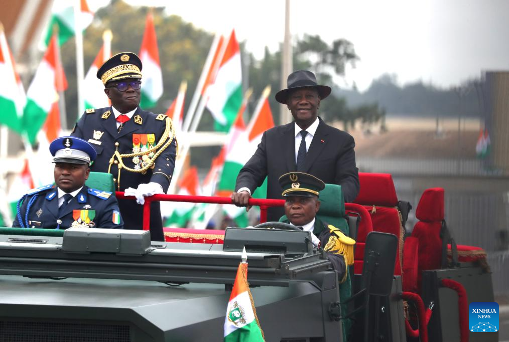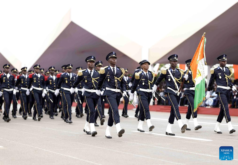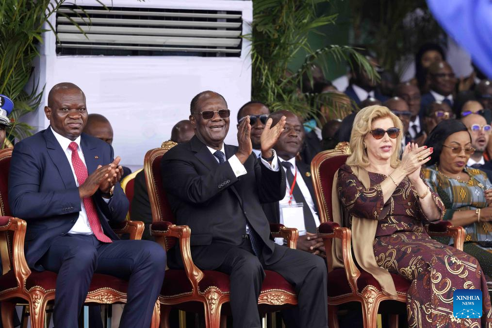 Ivorian President Alassane Ouattara (front, C) attends a military parade marking the 65th anniversary of Cote d'Ivoire's independence in Bouake, Cote d'Ivoire, Aug. 7, 2025. (Photo by Yvan Sonh/Xinhua)