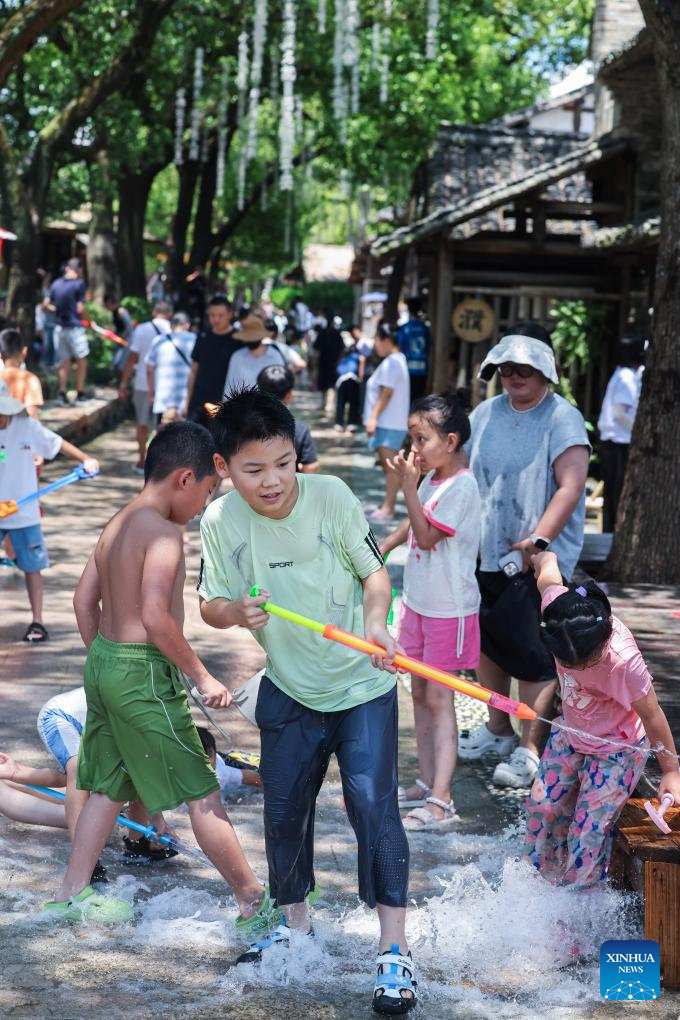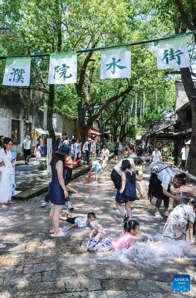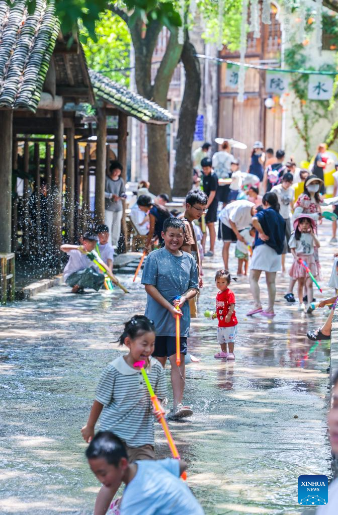 Kids have fun playing with water at the Puyuan Fashion Resort in Puyuan Town of Tongxiang City, east China's Zhejiang Province, Aug. 8, 2025. Recently, the Puyuan Fashion Resort launched a series of summer-themed parent-child activities, including origami summer camps, handicraft weaving, and traditional Chinese culture classes, to promote the development of summer tourism in the town. (Xinhua/Xu Yu)