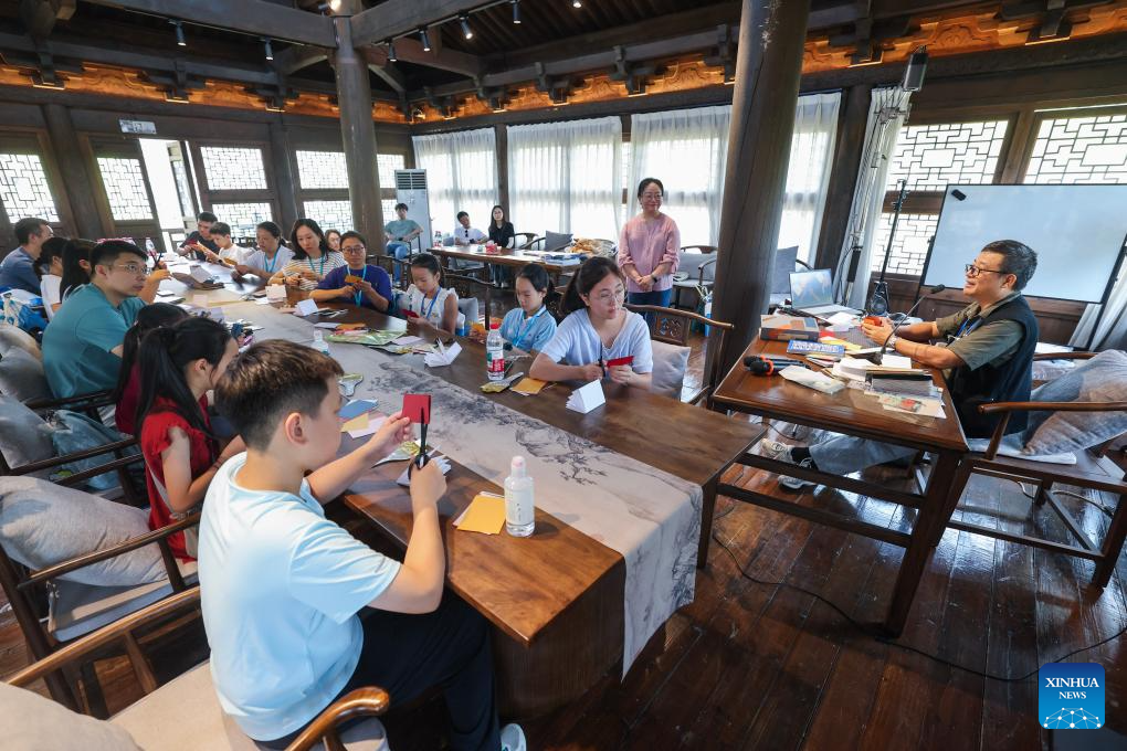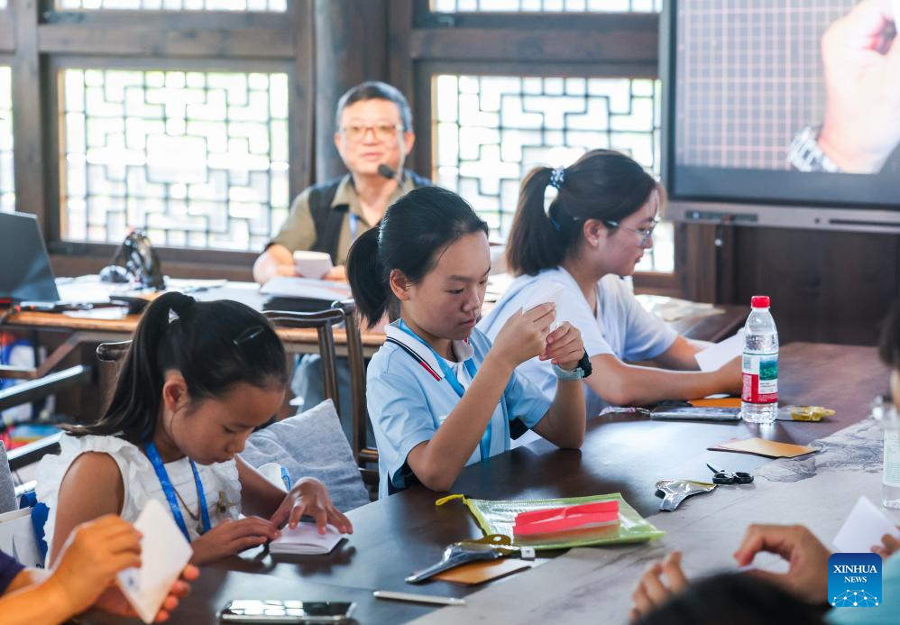 Kids learn origami art during a summer camp at the Puyuan Fashion Resort in Puyuan Town of Tongxiang City, east China's Zhejiang Province, Aug. 8, 2025. Recently, the Puyuan Fashion Resort launched a series of summer-themed parent-child activities, including origami summer camps, handicraft weaving, and traditional Chinese culture classes, to promote the development of summer tourism in the town. (Xinhua/Xu Yu)
