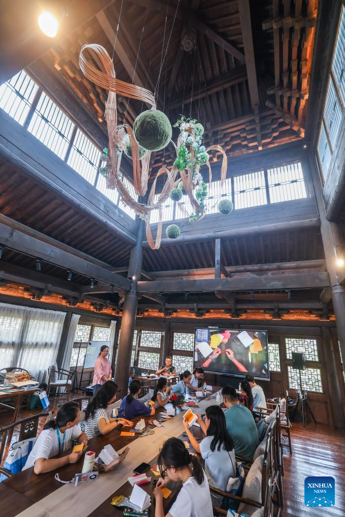 Kids and their parents learn origami art during a summer camp at the Puyuan Fashion Resort in Puyuan Town of Tongxiang City, east China's Zhejiang Province, Aug. 8, 2025. Recently, the Puyuan Fashion Resort launched a series of summer-themed parent-child activities, including origami summer camps, handicraft weaving, and traditional Chinese culture classes, to promote the development of summer tourism in the town. (Xinhua/Xu Yu)