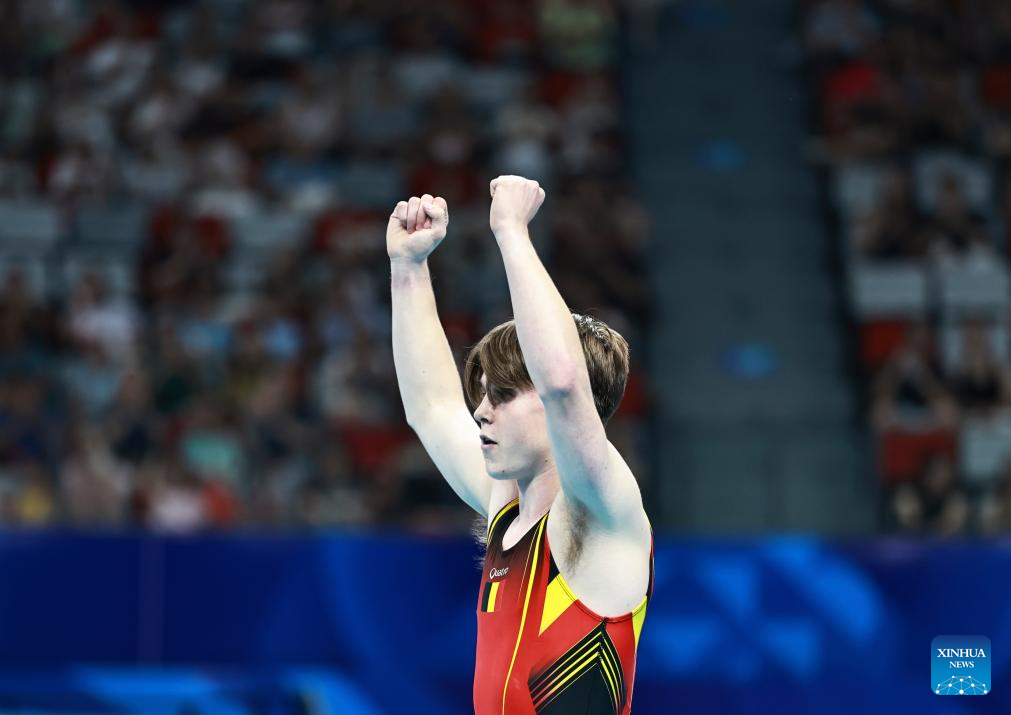 Brent Deklerck of Belgium celebrates after winning the men's double mini-trampoline final of the Trampoline Gymnastics event at The World Games 2025 in Chengdu, southwest China's Sichuan Province, Aug. 9, 2025. (Xinhua/Sun Fanyue)
