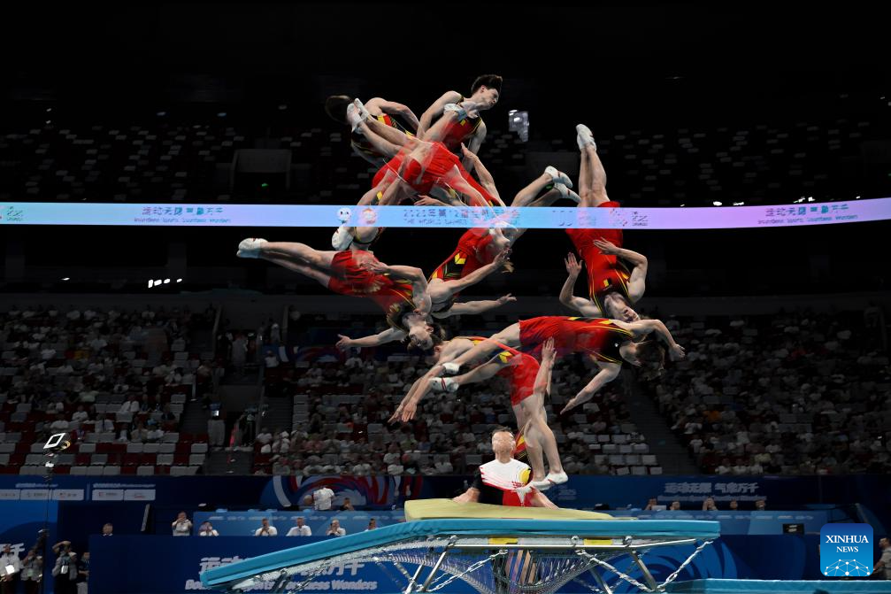 This multiple-exposure photo shows Deklerck Brent of Belgium competing during the men's double mini-trampoline final of the Trampoline Gymnastics event at The World Games 2025 in Chengdu, southwest China's Sichuan Province, Aug. 9, 2025. (Xinhua/Sun Fanyue)