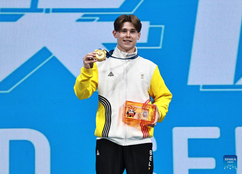 Gold medalist Brent Deklerck of Belgium poses during the awarding ceremony for the men's double mini-trampoline of the Trampoline Gymnastics event at The World Games 2025 in Chengdu, southwest China's Sichuan Province, Aug. 9, 2025. (Xinhua/Sun Fanyue)