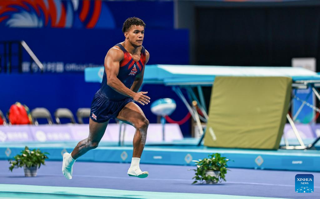 Omo Aikeremiokha of Britain competes during the men's double mini-trampoline final of the Trampoline Gymnastics event at The World Games 2025 in Chengdu, southwest China's Sichuan Province, Aug. 9, 2025. (Xinhua/Sun Fanyue)
