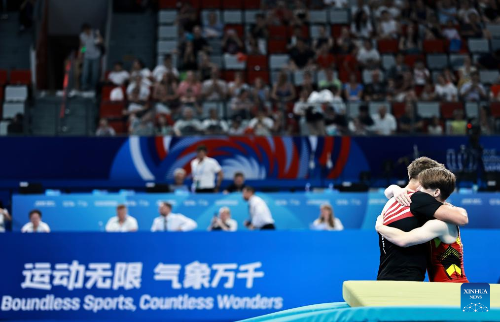 Brent Deklerck (R) of Belgium hugs his coach after winning the men's double mini-trampoline final of the Trampoline Gymnastics event at The World Games 2025 in Chengdu, southwest China's Sichuan Province, Aug. 9, 2025. (Xinhua/Sun Fanyue)