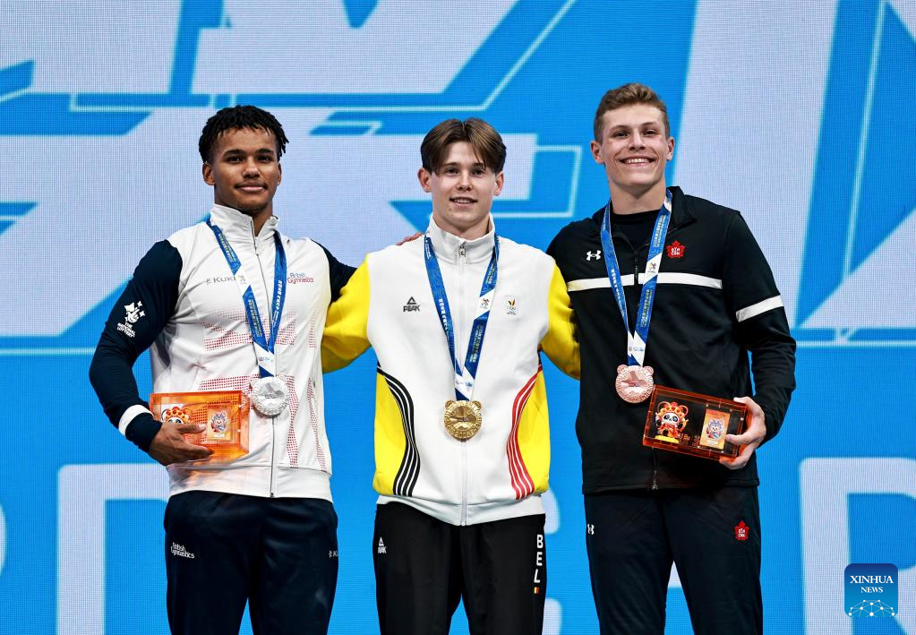 Gold medalist Brent Deklerck (C) of Belgium, silver medalist Omo Aikeremiokha (L) of Britain and bronze medalist Gavin Dodd of Canada pose during the awarding cermony for the men's double mini-trampoline of the Trampoline Gymnastics event at The World Games 2025 in Chengdu, southwest China's Sichuan Province, Aug. 9, 2025. (Xinhua/Sun Fanyue)
