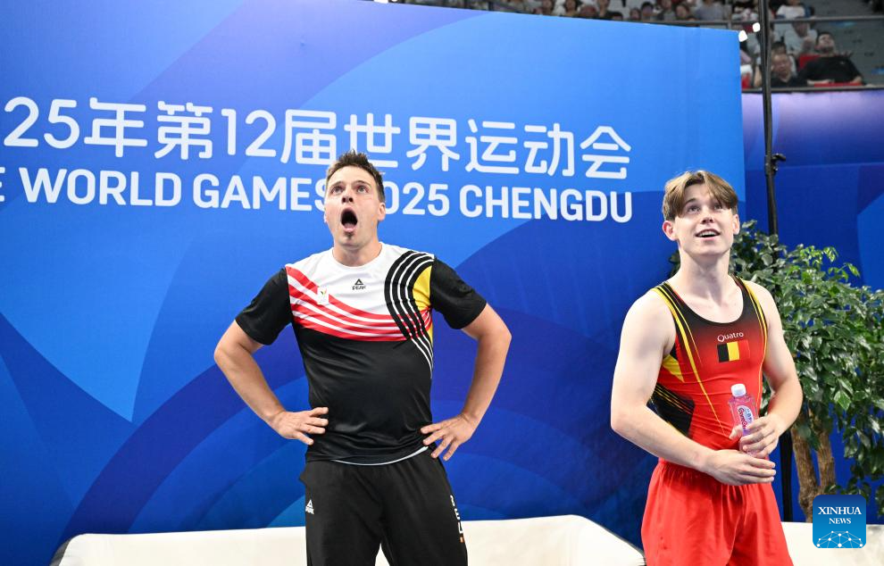 Deklerck Brent (R) of Belgium waits for the results during the men's double mini-trampoline final of the Trampoline Gymnastics event at The World Games 2025 in Chengdu, southwest China's Sichuan Province, Aug. 9, 2025. (Xinhua/Sun Fanyue)