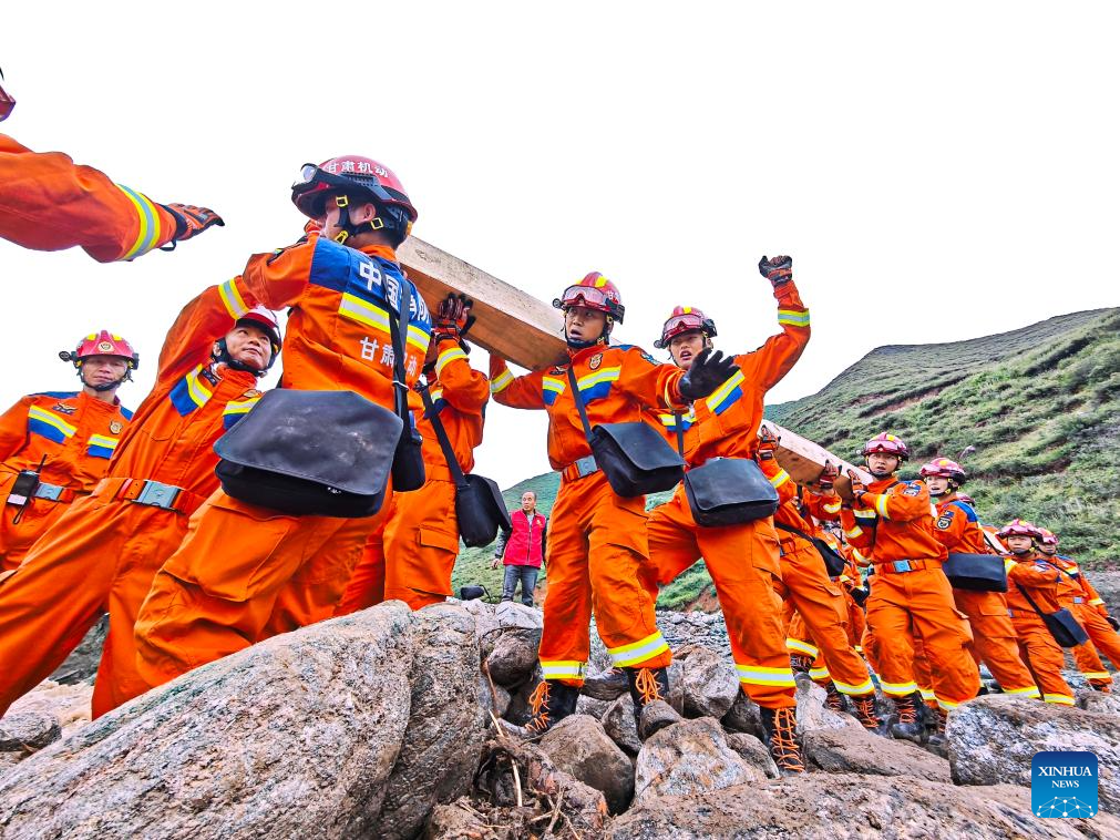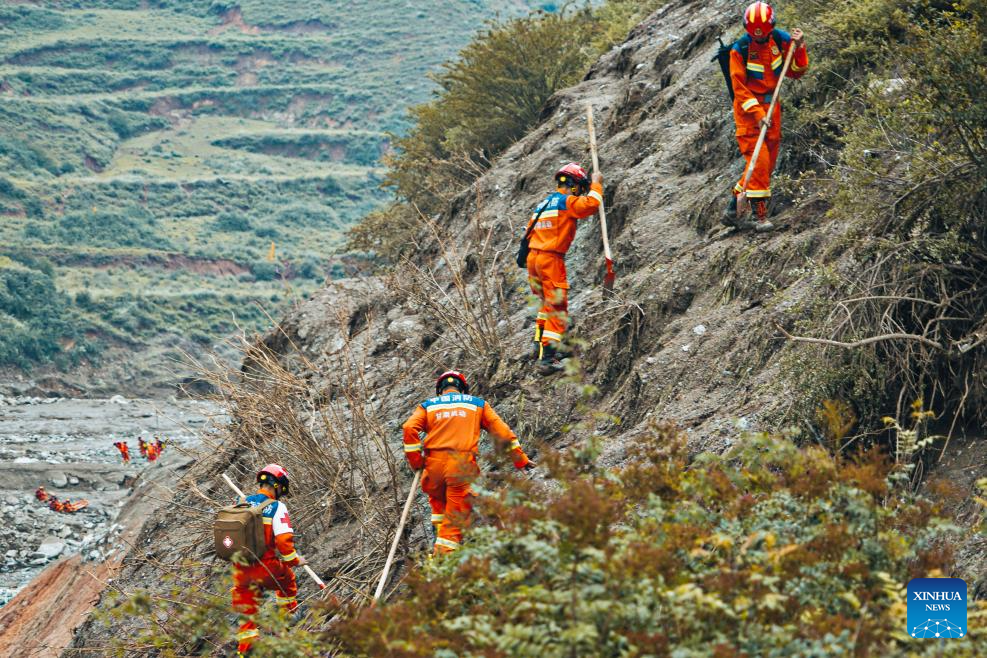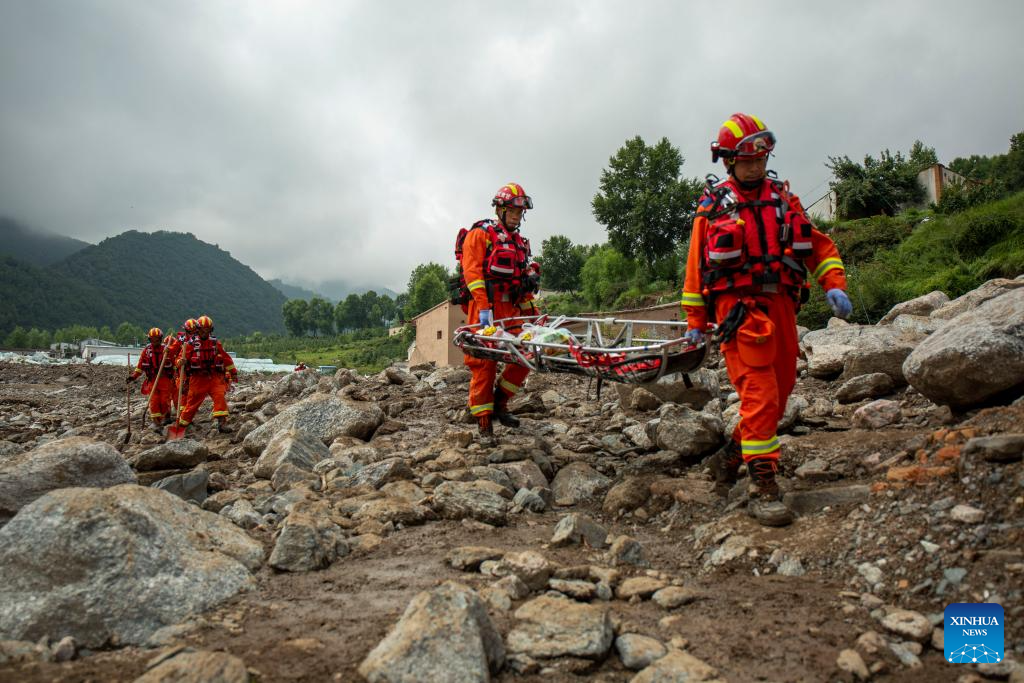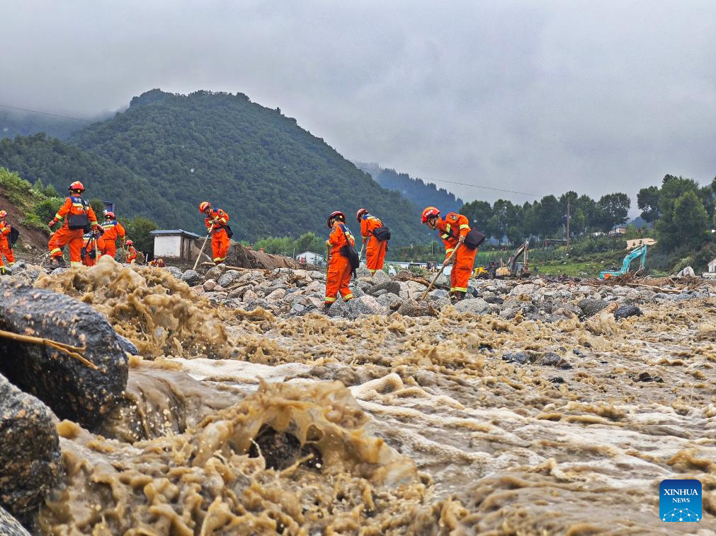 Rescuers search for missing individuals in Yuzhong County of northwest China's Gansu Province, Aug. 9, 2025. Rescue efforts are underway after continuous heavy rainfall triggered mountain torrents in Yuzhong County. (Xinhua)