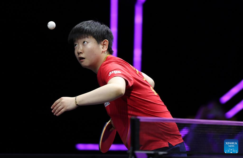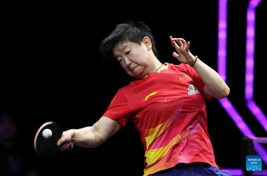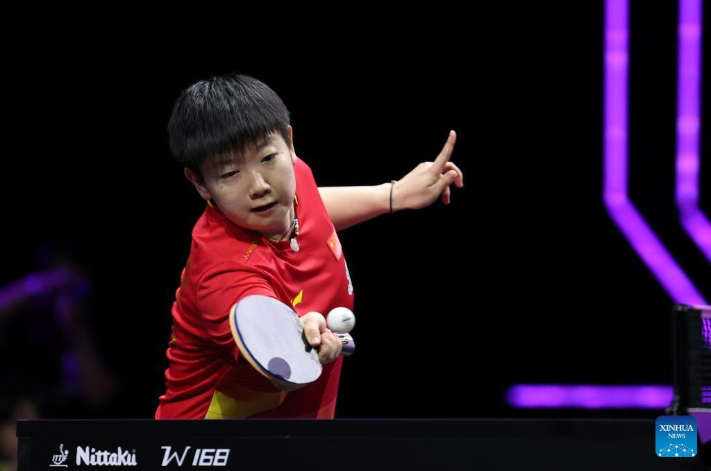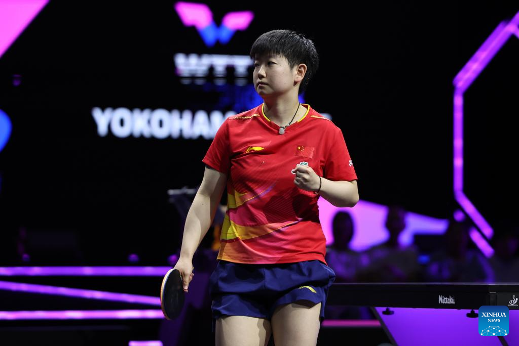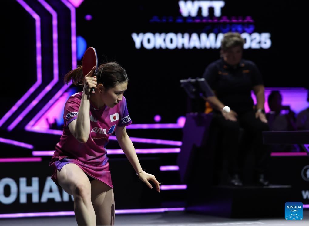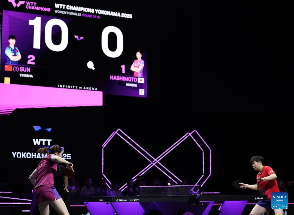 Sun Yingsha hits a return during the women's singles round of 16 match between Sun Yingsha of China and Hashimoto Honoka of Japan at the WTT Champions Yokohama 2025 in Yokohama, Japan, Aug. 9, 2025. (Xinhua/Yue Chenxing)