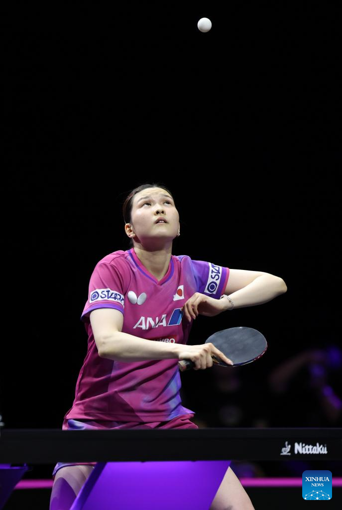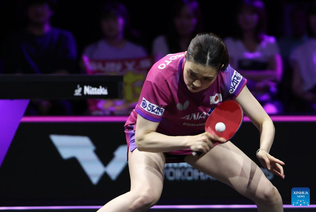 Hashimoto Honoka hits a return during the women's singles round of 16 match between Sun Yingsha of China and Hashimoto Honoka of Japan at the WTT Champions Yokohama 2025 in Yokohama, Japan, Aug. 9, 2025. (Xinhua/Yue Chenxing)