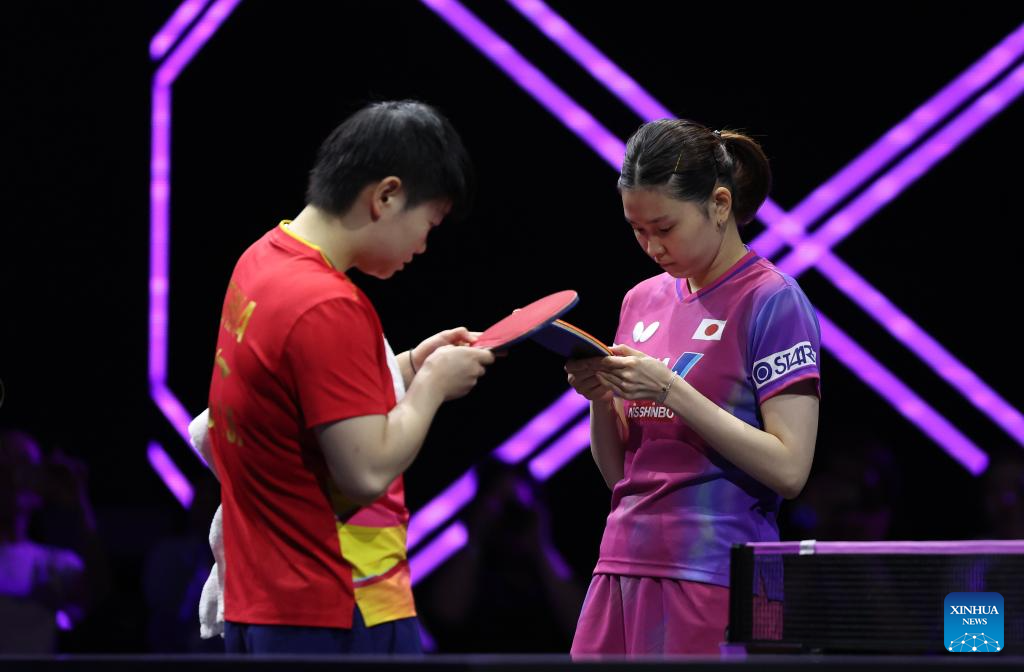 Sun Yingsha (R) of China and Hashimoto Honoka of Japan compete during the women's singles round of 16 match at the WTT Champions Yokohama 2025 in Yokohama, Japan, Aug. 9, 2025. (Xinhua/Yue Chenxing)