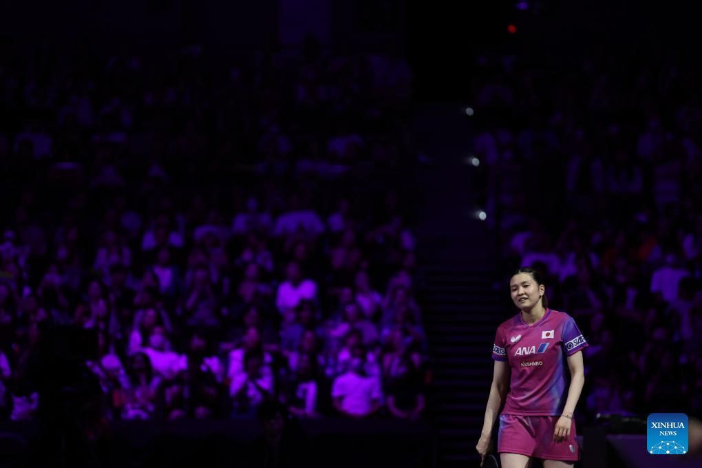 Hashimoto Honoka reacts during the women's singles round of 16 match between Sun Yingsha of China and Hashimoto Honoka of Japan at the WTT Champions Yokohama 2025 in Yokohama, Japan, Aug. 9, 2025. (Xinhua/Yue Chenxing)