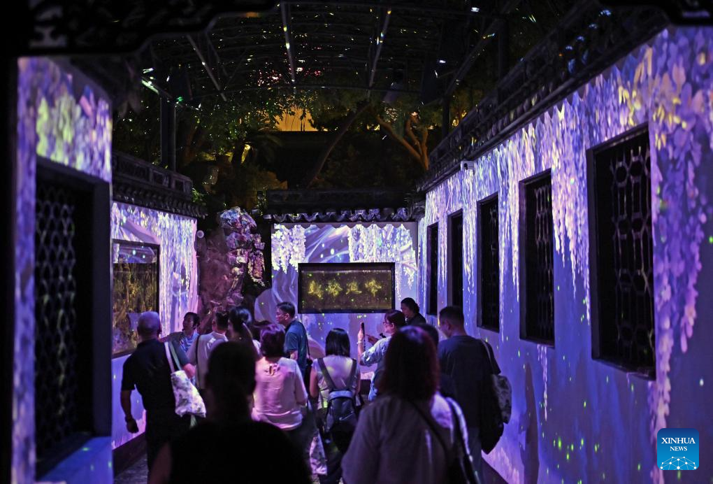A woman views an ancient painting presented via digital technology in Yuyuan Garden, Shanghai, east China, on Aug. 8, 2025. Yuyuan Garden, a historic and cultural landmark in Shanghai, began offering night tours on Friday. (Xinhua/Liu Ying)