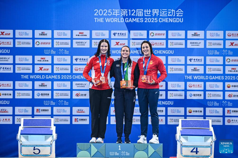 Gold medalist Lucrezia Fabretti (C) of Italy, silver medalist Lena Oppermann (L) of Germany and bronze medalist Antia Garcia Silva of Spain pose during the victory ceremony for the women's 100m manikin carry with fins final match of Life Saving event at the World Games 2025 in Chengdu, southwest China's Sichuan Province, Aug. 8, 2025. (Xinhua/Jiang Han)