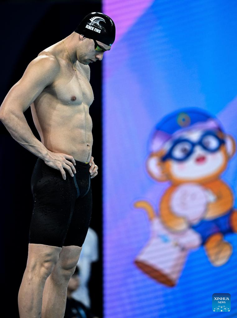 Fergus Eadie of New Zealand reacts before the men's 100m manikin carry with fins final match of Life Saving event at the World Games 2025 in Chengdu, southwest China's Sichuan Province, Aug. 8, 2025. (Xinhua/Jiang Han)
