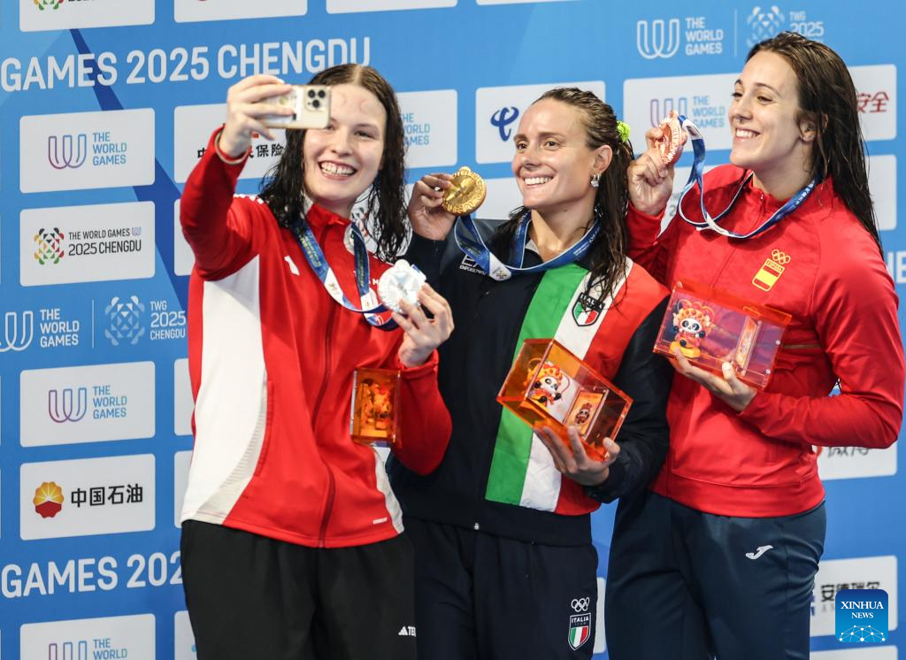 Gold medalist Lucrezia Fabretti (C) of Italy, silver medalist Lena Oppermann (L) of Germany and bronze medalist Antia Garcia Silva of Spain take selfies during the victory ceremony for the women's 100m manikin carry with fins final match of Life Saving event at the World Games 2025 in Chengdu, southwest China's Sichuan Province, Aug. 8, 2025. (Xinhua/Zhang Liyun)
