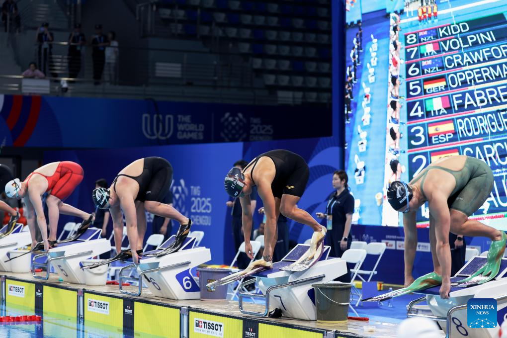 Swimmers start during the women's 100m manikin carry with fins final match of Life Saving event at the World Games 2025 in Chengdu, southwest China's Sichuan Province, Aug. 8, 2025. (Xinhua/Zhang Liyun)