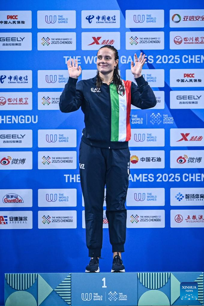 Gold medalist Lucrezia Fabretti of Italy reacts during the victory ceremony for the women's 100m manikin carry with fins final match of Life Saving event at the World Games 2025 in Chengdu, southwest China's Sichuan Province, Aug. 8, 2025. (Xinhua/Jiang Han)