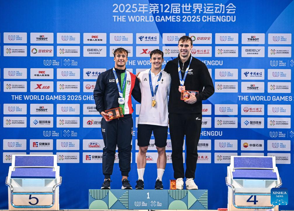 Gold medalist Tom Durager (C) of France, silver medalist Davide Cremonini (L) of Italy and bronze medalist Fergus Eadie of New Zealand pose during the victory ceremony for the men's 100m manikin carry with fins final match of Life Saving event at the World Games 2025 in Chengdu, southwest China's Sichuan Province, Aug. 8, 2025. (Xinhua/Jiang Han)